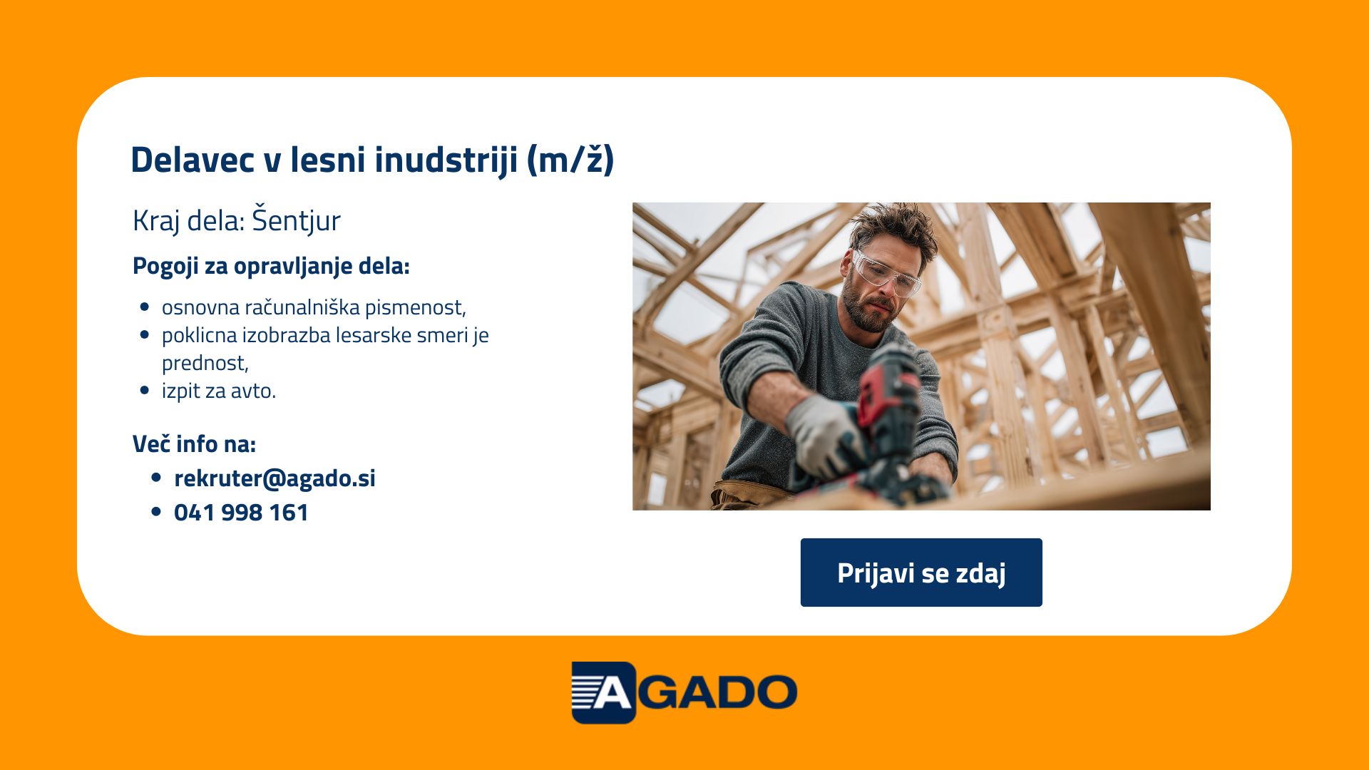 Če vas delo zanima in se prepoznate v opisu, vas vabimo, da oddate svojo prijavo. Za več informacij o delovnem mestu, nas lahko kontaktirate na tel. št. 041 998 161 ali preko e-pošte rekruter@agado.si.