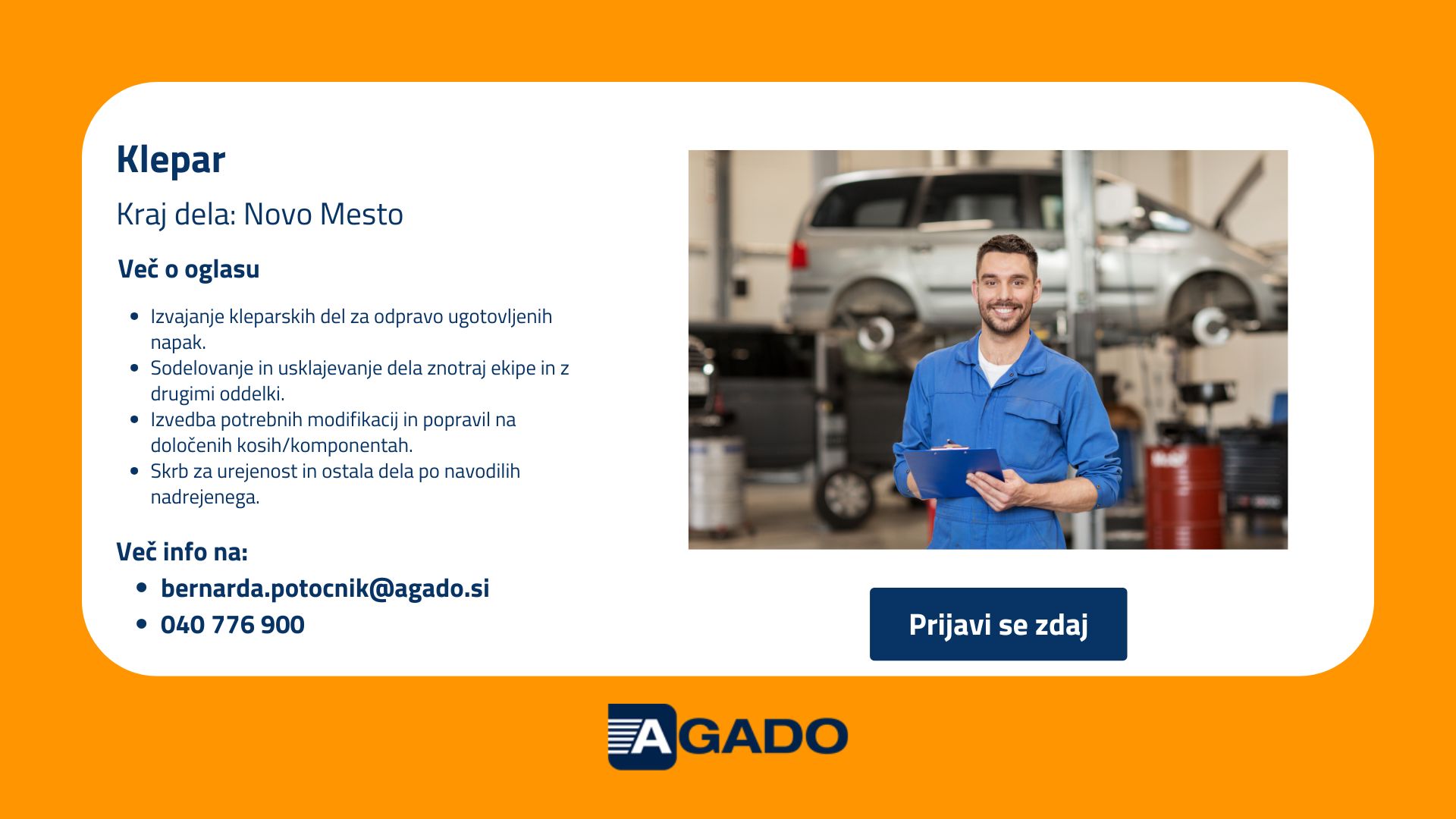 Če vas delo zanima in se prepoznate v opisu, vas vabimo, da oddate svojo prijavo. Za več informacij o delovnem mestu, nas lahko kontaktirate na tel. št. +386 40 776 900 ali preko e-pošte bernarda.potocnik@agado.si.