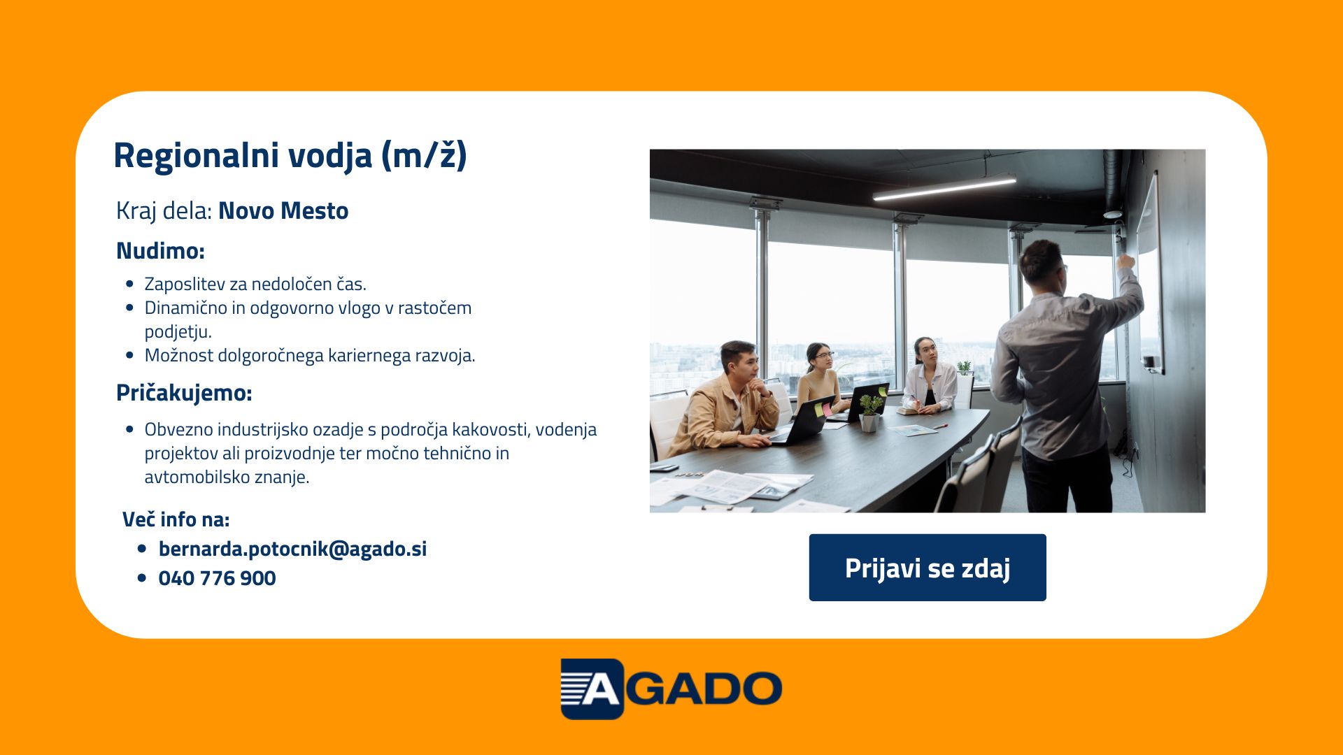 Če ste pripravljeni voditi z zgledom, strateško razmišljati in se povezovati z različnimi deležniki, potem vas vabimo k prijavi!
