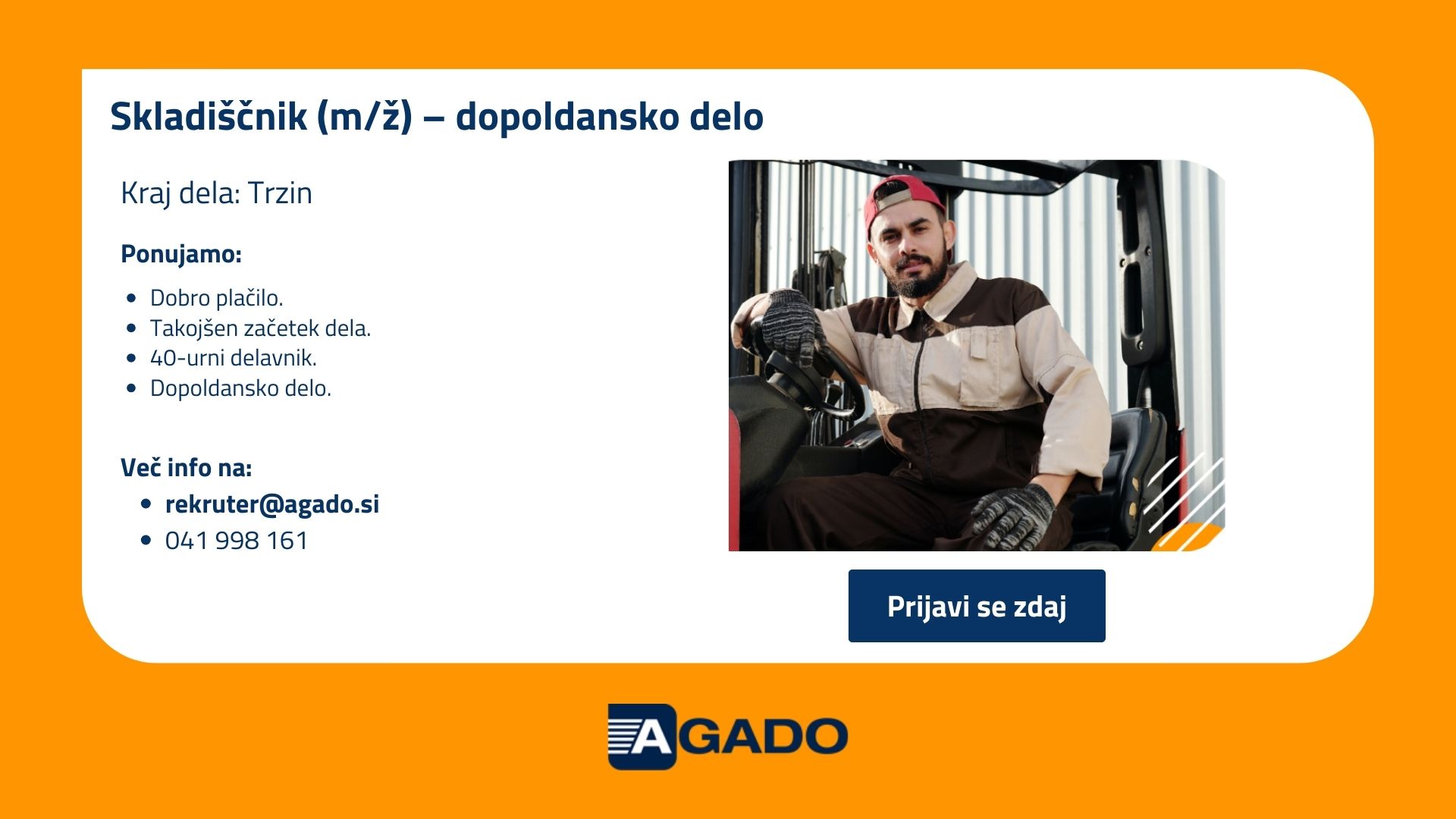 V kolikor imate dodatna vprašanja o delovnem mestu, nas lahko kontaktirate na tel. št. 041 998 161 ali preko e-pošte rekruter@agado.si.