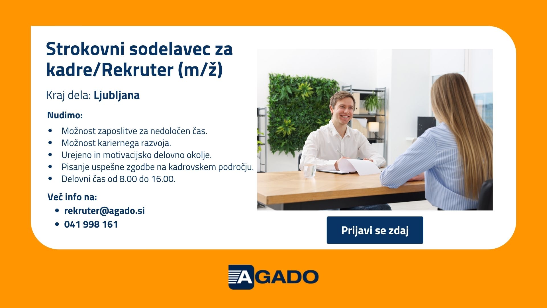 V kolikor imate dodatna vprašanja o delovnem mestu, nas lahko kontaktirate na tel. št. 041 998 161 ali preko e-pošte rekruter@agado.si.