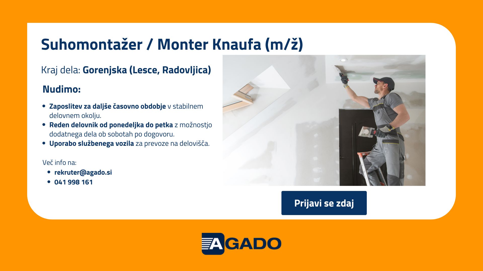 V kolikor imate dodatna vprašanja o delovnem mestu, nas lahko kontaktirate na tel. št. 041 998 161 ali preko e-pošte rekruter@agado.si.